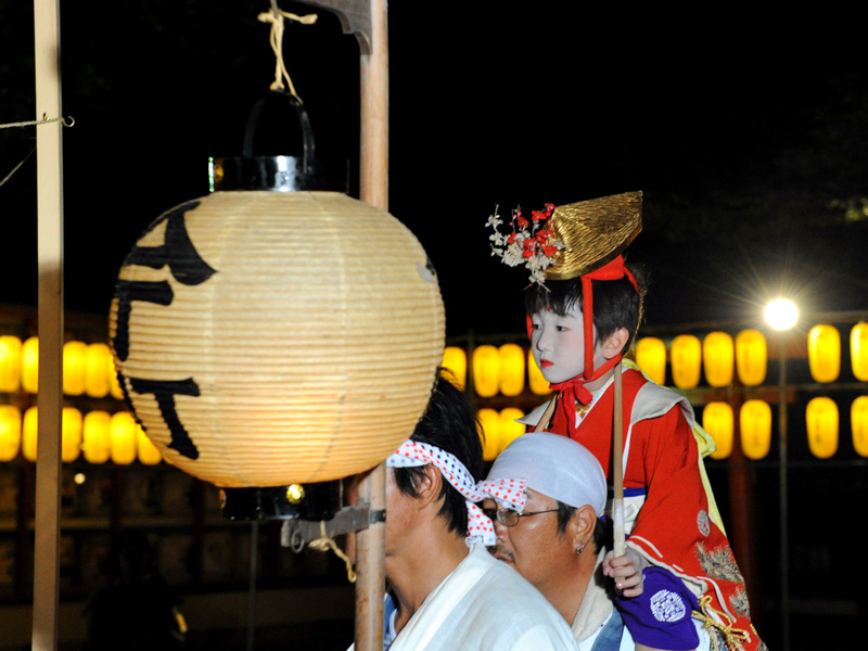 宵祭りの前夜、稚児は5歳前後の男の子で地面を歩きません。江戸期には神社に着くと拝殿の周りを杖で打ちながら廻ったことから「打ち廻し」と言われるようになりました。宵祭り、朝祭りの安全祈願の神事です。