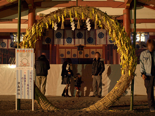 地元の津島神社にお正月に置かれる茅の輪(ちのわ)くぐりです。8の字を描くようにくぐり、一年の無病息災を祈念します。
