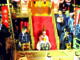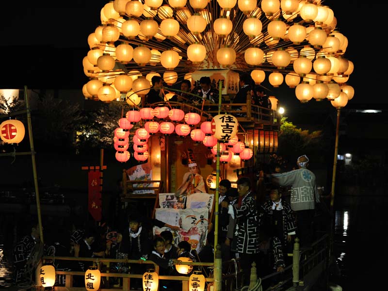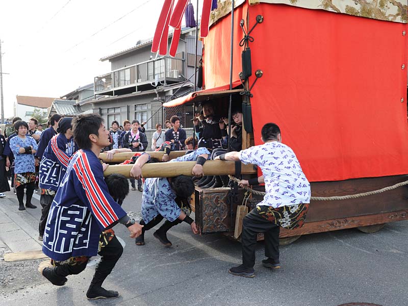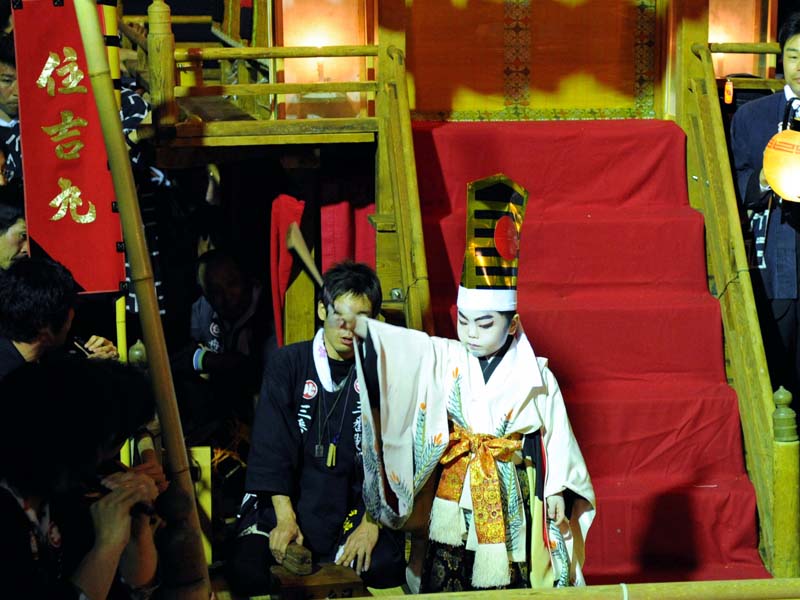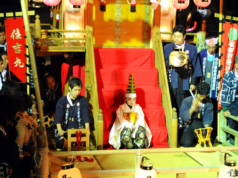 半田ちんとろ祭りの模様です。市指定文化財です。 津島川祭りの車楽船のミニチュア版で、稚児が三羽叟を演じます。