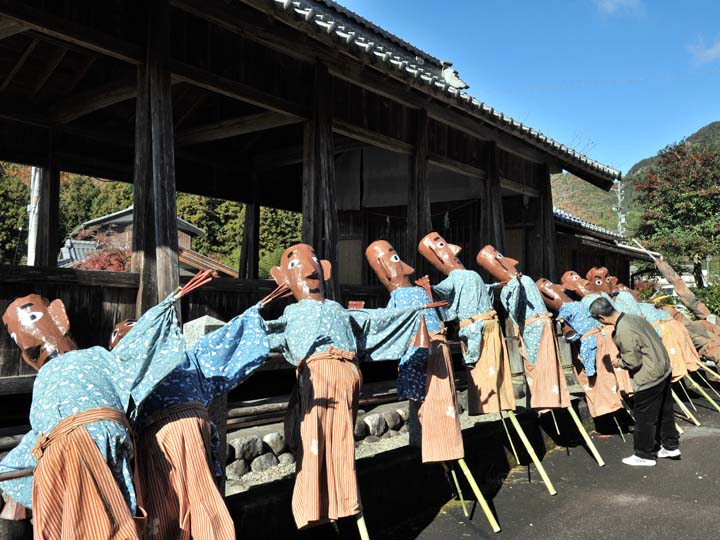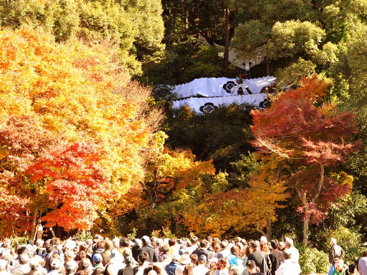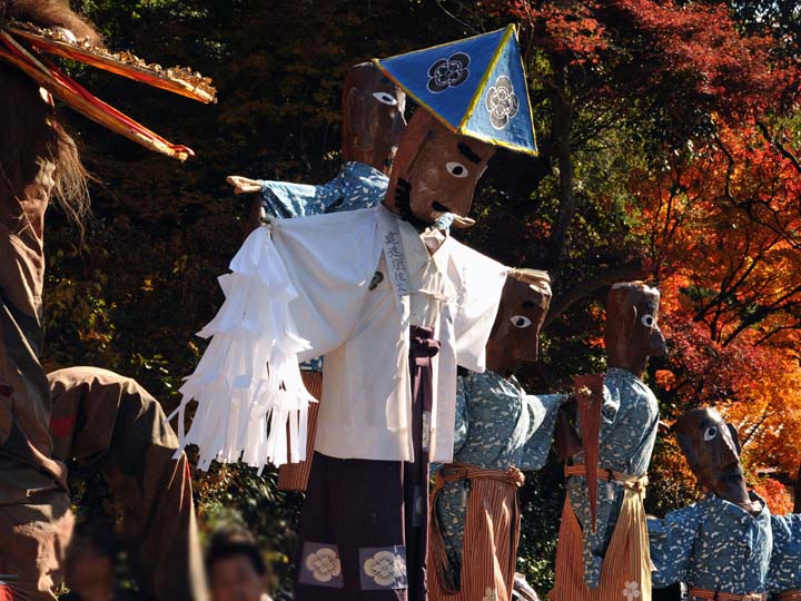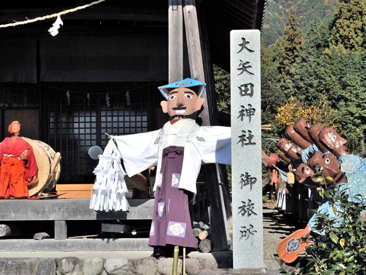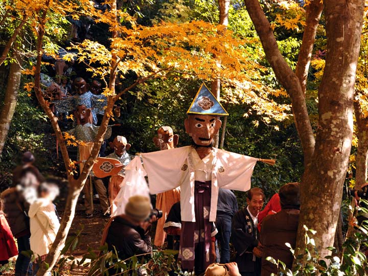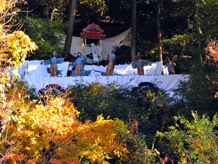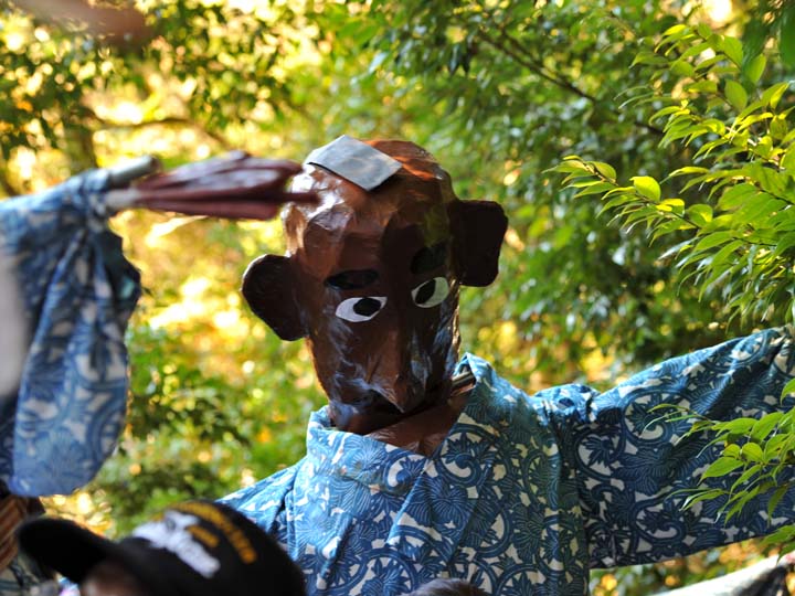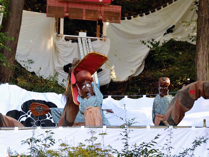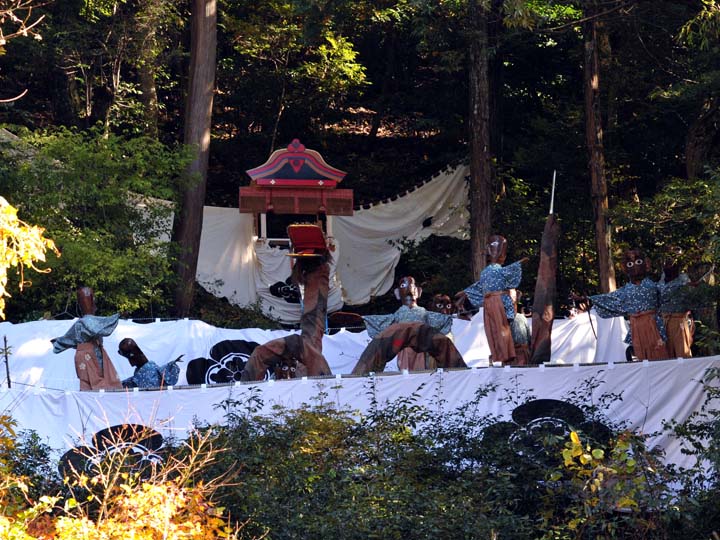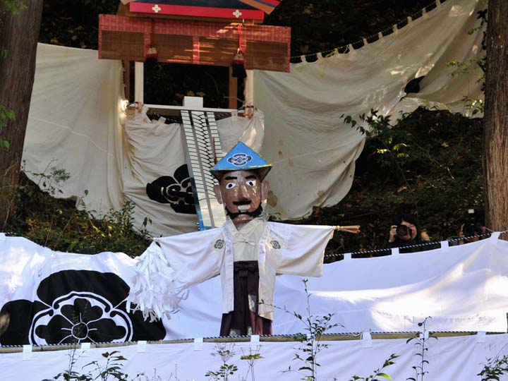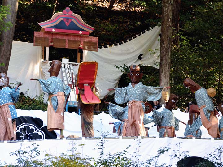 国選択無形民俗文化財です。 岐阜県美濃市大矢田神社に伝わる500年続く五穀豊穣を祈願する人形劇のお祭りです。山の中腹に舞台と言っても幕が張ってあるだけですが、そこでまず最初に神主のお払いで観客の身を清めて頂きます。そののち農民達の舞いがあり、続いてヤマタノオロチが登場し農民達を食べてしまいます。全部食べ終わったところで神主扮するスサノウノミコトが登場し大蛇を退治してメデタシメデタシという、とっても楽しいお祭りです。