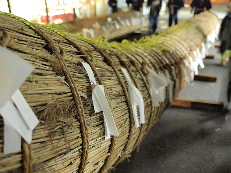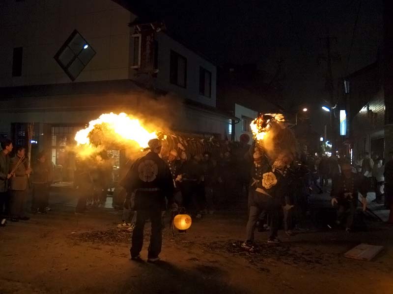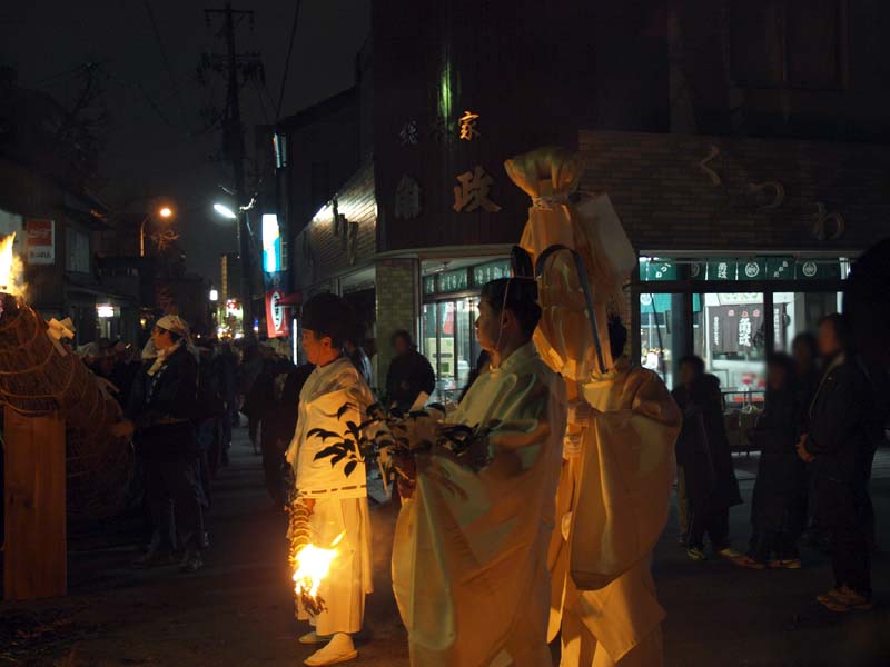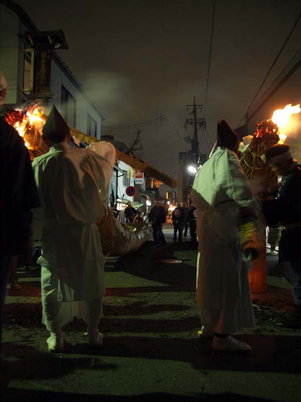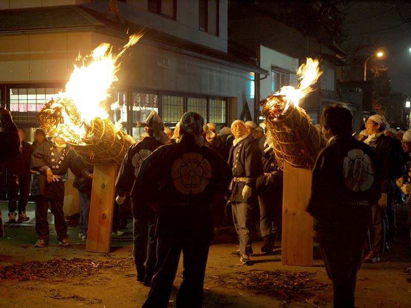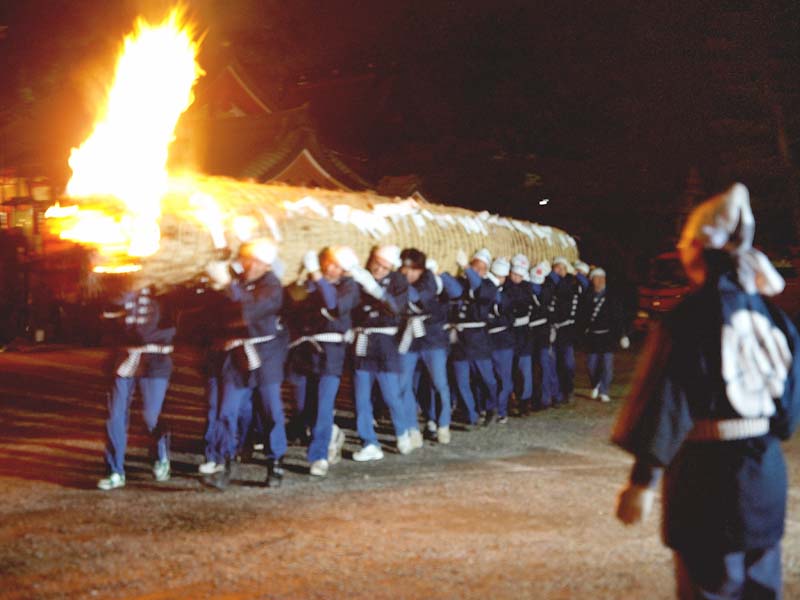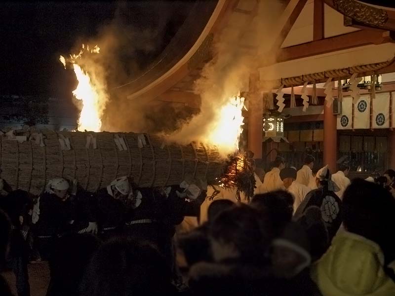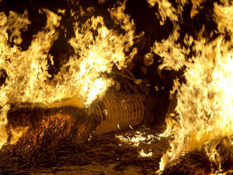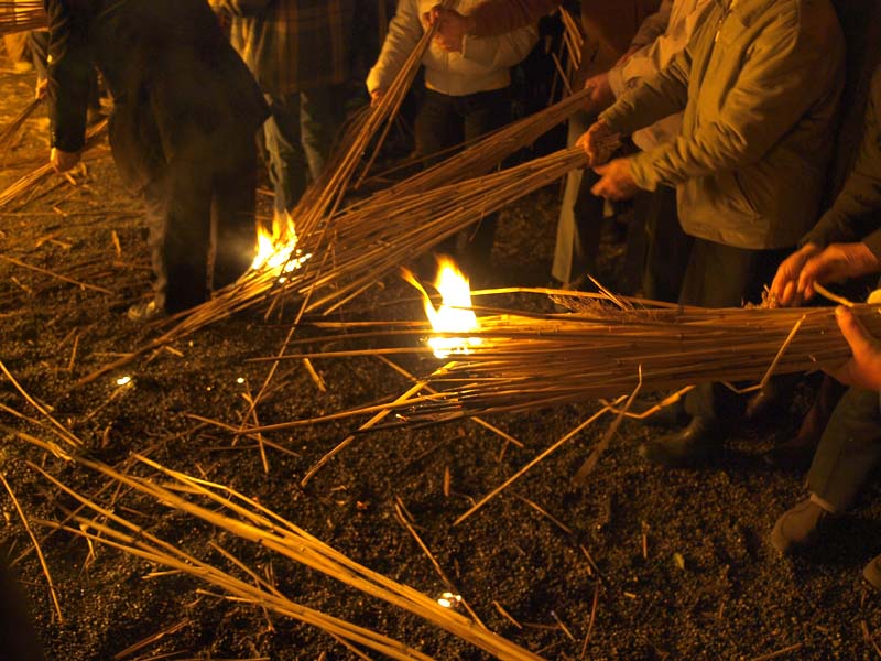 家内安全・無病息災を祈願して燃え盛る大松明(葦を束ねたもの)から葦を引き抜き家に持ち帰ります。