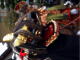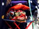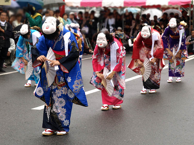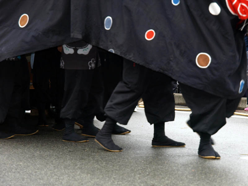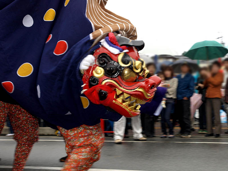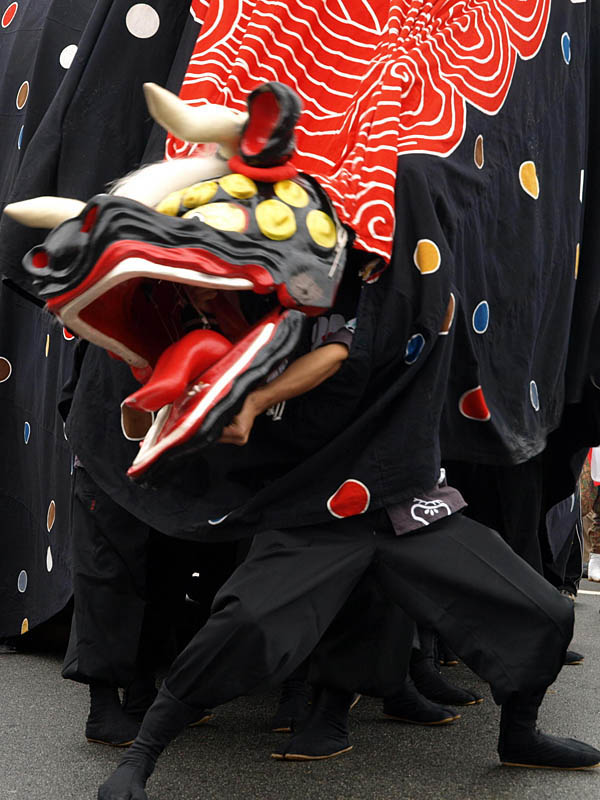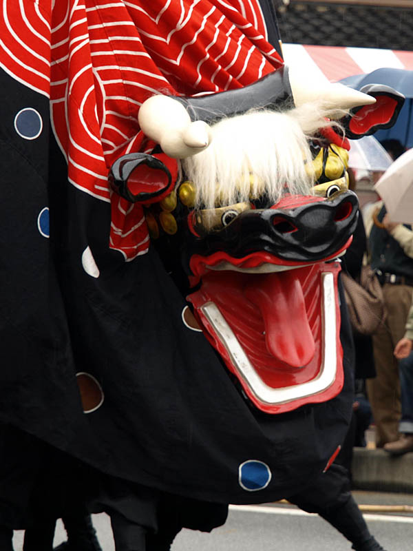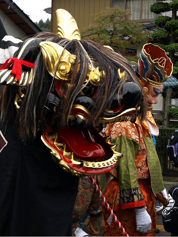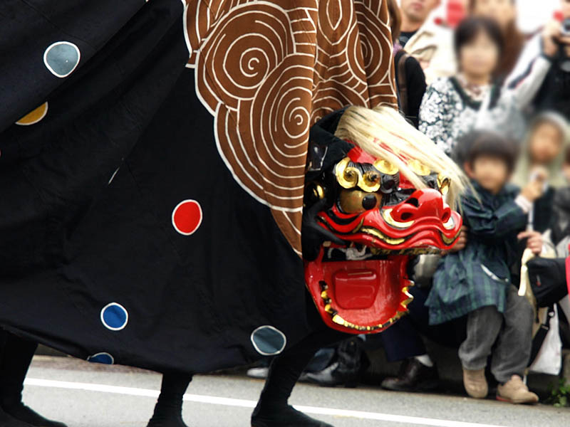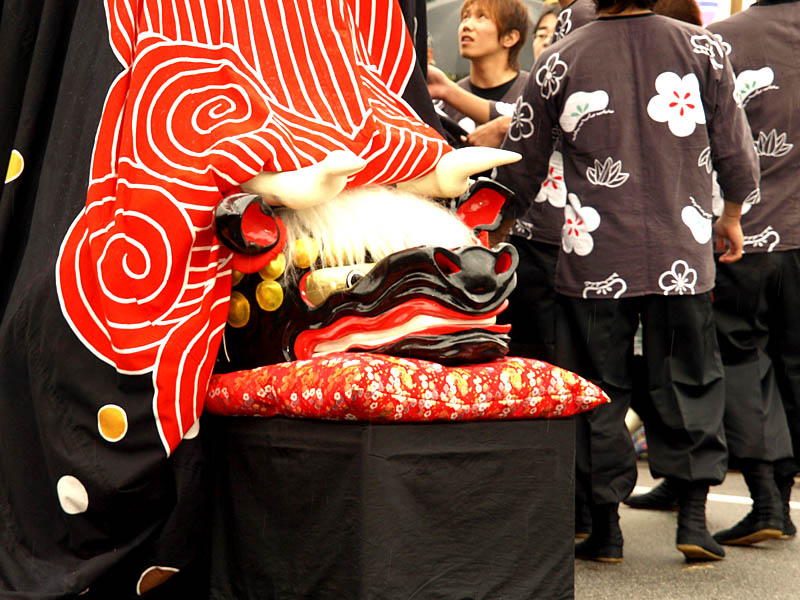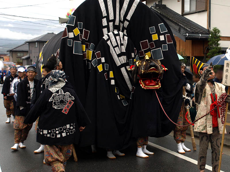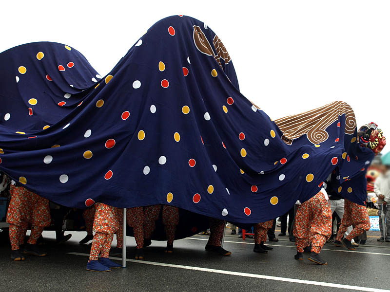 普通の獅子舞に屋台がくっついています。それを布で覆っています。