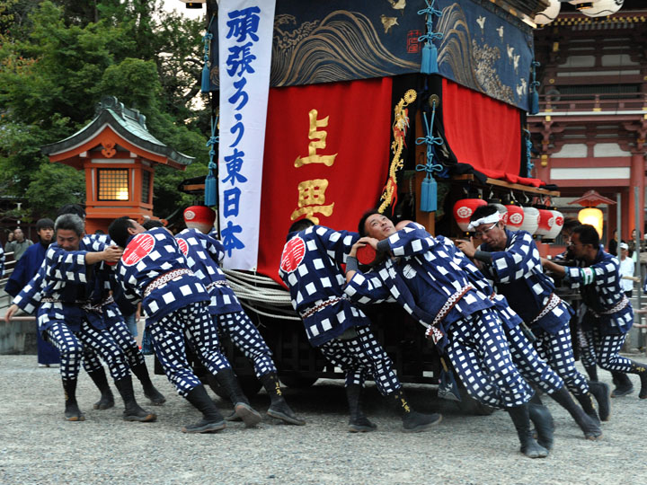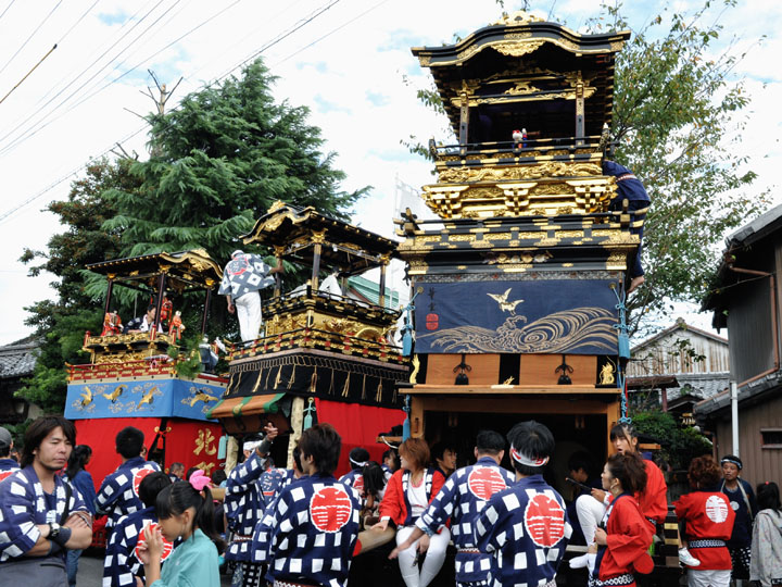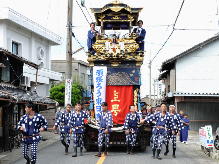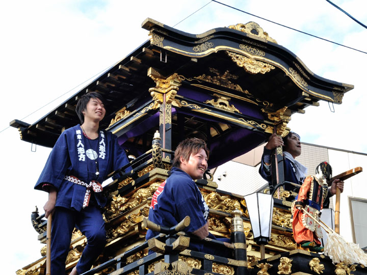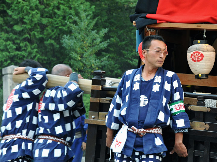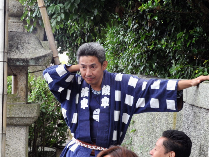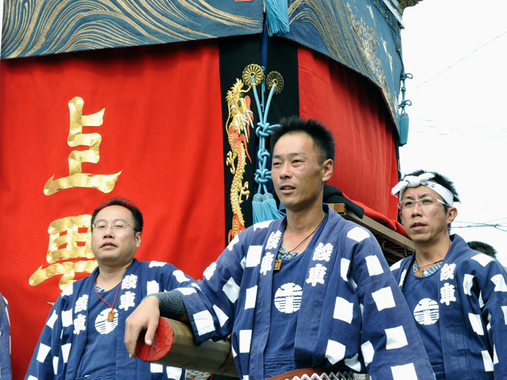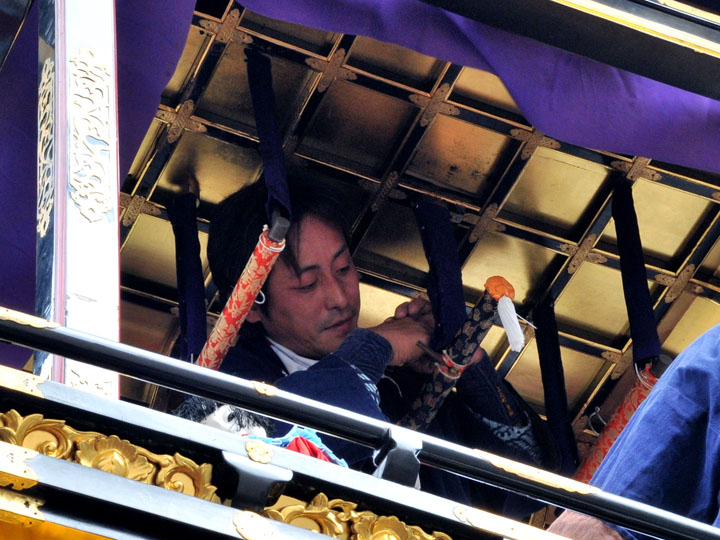 血沸き肉躍る興奮状態!いつでもかかってこい!の上車メンバーが繰り広げる人形からくりと車切りであります。 山車の前輪を上げて、くるくるくるくる・・・と上車メンバーが疲れ果てるまで行う車切りは東洋一の奇祭と言っても過言ではありません。
